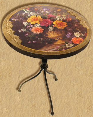 Michal David's Romantic tables are revivals of the very typical Classic Romantic and Victorian decorative tables .They designs are placed on wood and are based on the original paintings reproduction of those days using Fang Chui spirit. There are many layers of artistic hand work on every table composed with various materials, jeweled with hundreds of Crystal stones and perfect finishing touch. The tables are round 50 cm(20") with beautiful gold or black colored iron legs designed with crystal chains. Michal's tables are very romantic designs and inspire love and peaceful energy in their area.